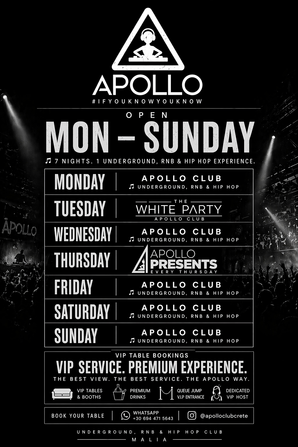 It’s all about the music. Famous for its Hip Hop, underground and RnB energy, Apollo Club has built its reputation around unforgettable nights and a unique atmosphere. The upscale VIP area is loved by guests looking for the full premium experience. Apollo Club is included in the Malia Access Party Wristband, but single tickets for Apollo Club are also available here on Malia Access. #IfYouKnowYouKnow